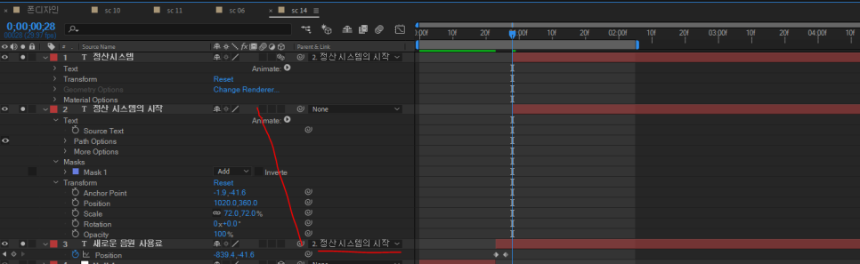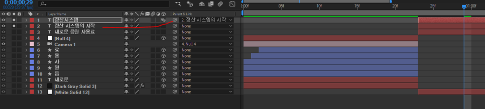 - 정산시스템 글자만 animate에서 Enable 3D~ 추가해주기 (밑에 카메라 때문에 이상하게 보이기 때문에 카메라 부분 레이어 Alt + ]로 편집 해주기