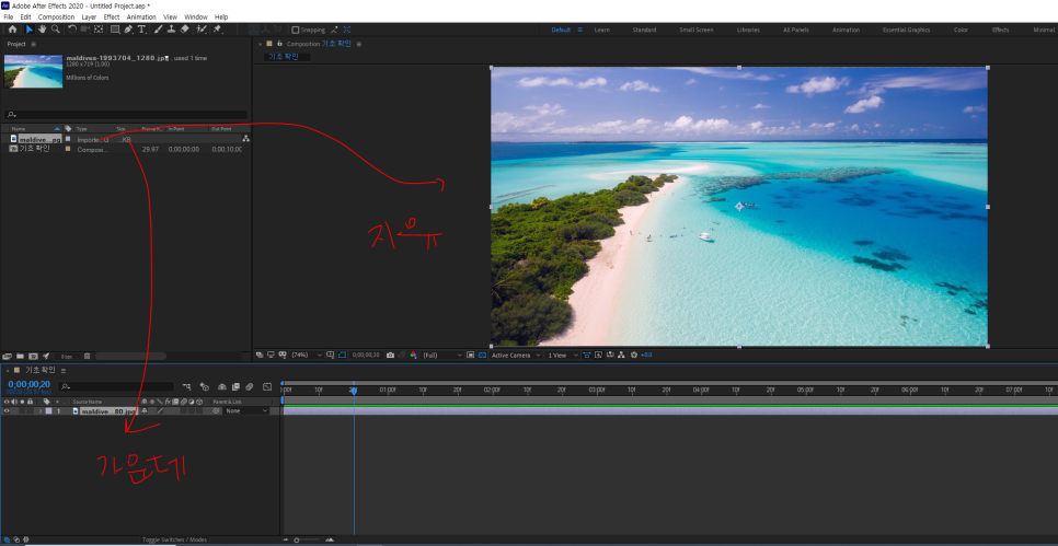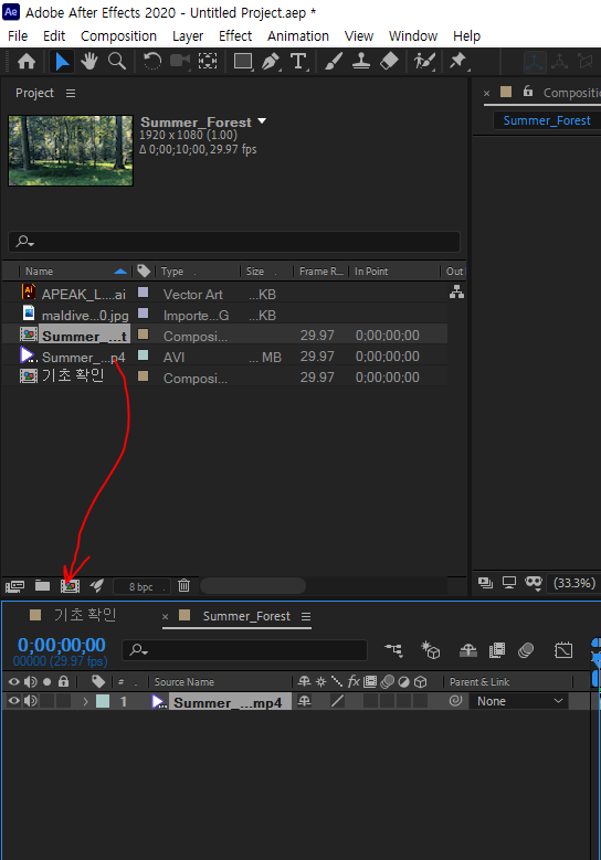 영상 밑에 컴포지션부분에 드래그 하면 자동배치됨