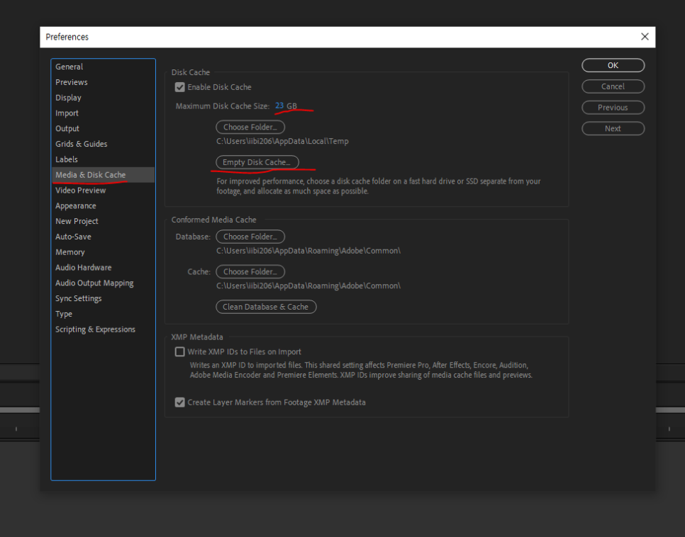 위에 Edit - preference - media & disk cache - empty disk cache (캐시파일 지우기)