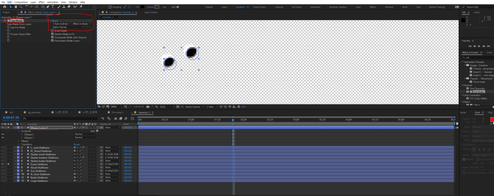 검정색 눈동자를 따로 그려주고 set matte효과로 eyes 레이어에 연결해서, 흰눈동자 내에서만 검정 눈동자 움직이도록 설정!!